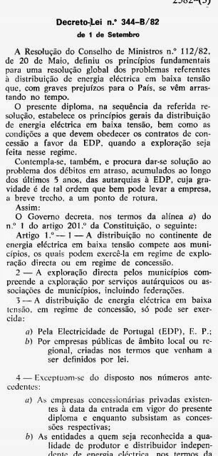 O Decreto-Lei 344/82 estabelece, preto no branco, que " a distribuição no continente de energia eléctrica em baixa tensão compete aos municípios, os quais podem exercê-la em regime de exploração directa ou em regime de concessão".